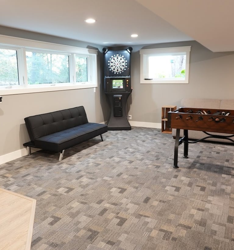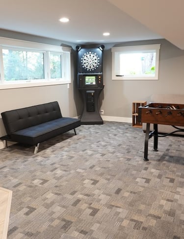 Recreation room with foosball, electronic darts, bean bag toss, bar and kitchenette